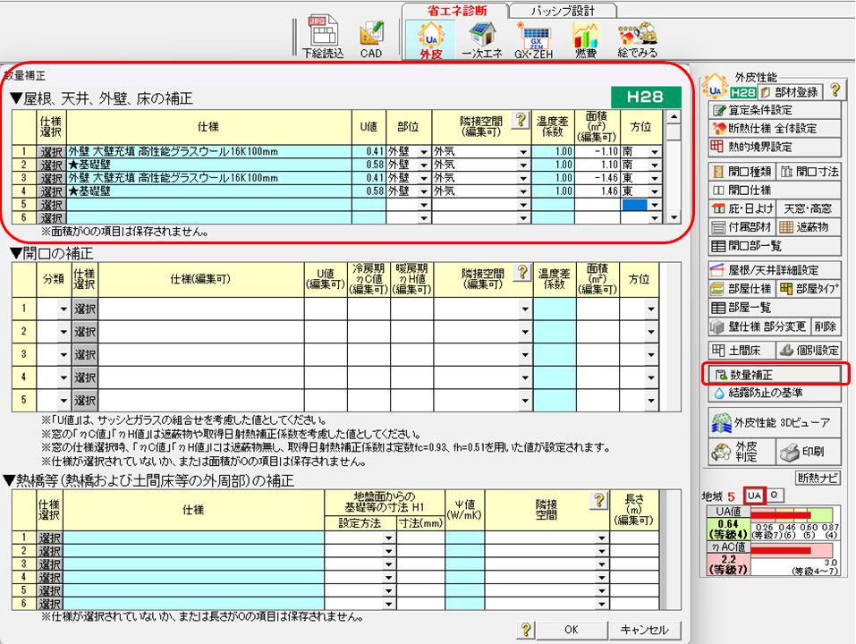 補正した箇所の面積根拠図は計算書に出力されませんが、補正した内容で外皮計算を行います。