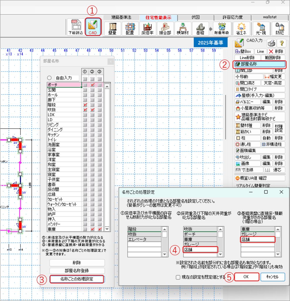 - ②③に土間床扱いにしたい部屋名を入力します。
