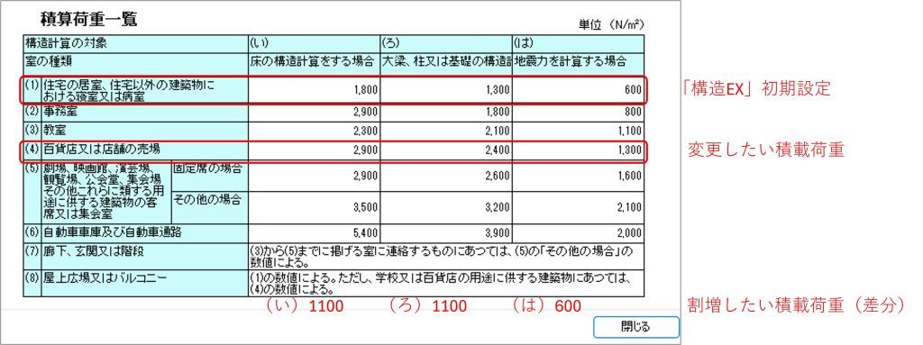 ※初期設定の「積載荷重(施行令第85条)」は「住宅の居室、住宅以外の建築物における寝室又は病室」の値です。建物の一部が「店舗の売り場」など室の種類が異なる場合は、室の種類に応じた積載荷重と住宅の居室の積載荷重の差分の値を割増荷重として設定します。