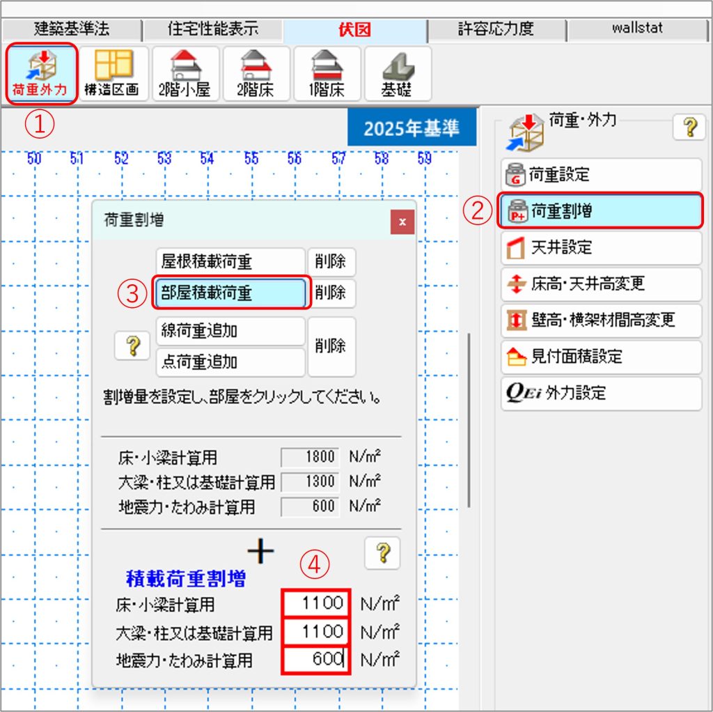- 積載荷重割増欄に値(※)を入力し、対象とする部屋をクリックします。