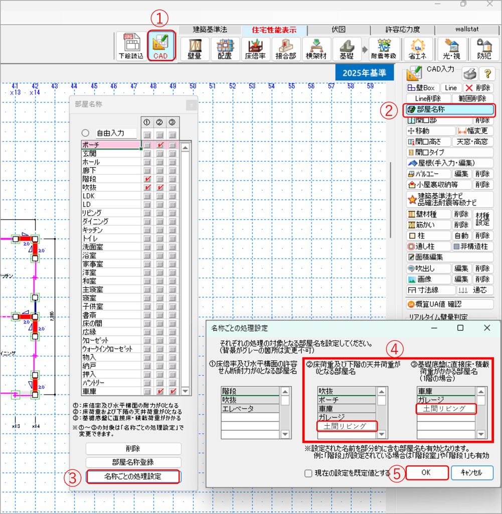 - 「②床荷重および下階の天井荷重が0となる部屋名」「③基礎底盤に直接床・積載荷重がかかる部屋名(1階の場合)」の枠内に土間床扱いにする部屋名を入力します。