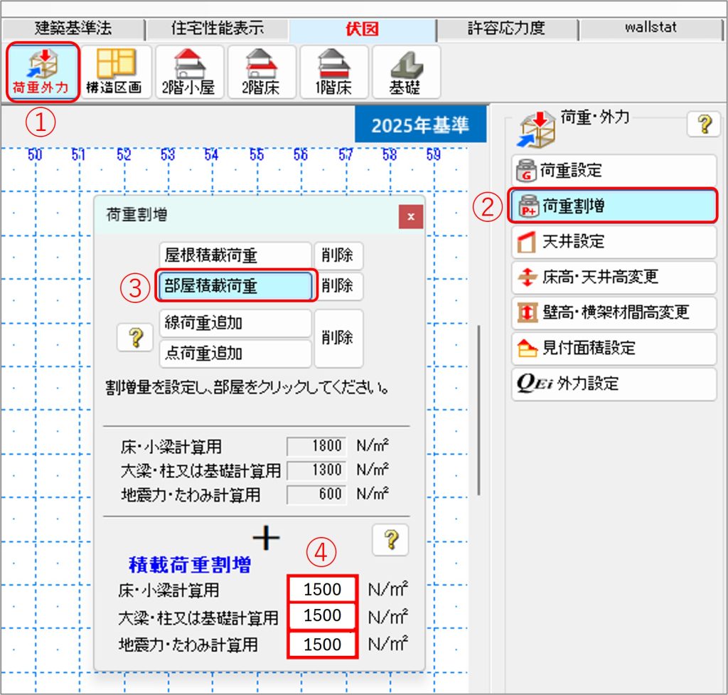 - [積載荷重割増]欄に値を入力し、対象とする部屋をクリックします