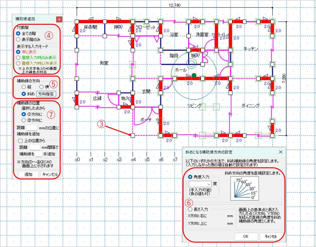 - [斜めになる補助線方向の設定]画面で、「角度入力」または「長さ入力」を選択・設定し[OK]をクリックします。